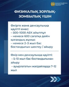 * өмір мен денсаулыққа қауіпті зорлық-зомбылықты қолдану 5 жылдан 10 жылға дейін, ал ауырлататын жағдайлар болған кезде 7 жылдан 12 жылға дейін бас бостандығынан айыруға жазаланады.