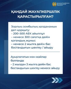 * зорлық-зомбылық қолданамын деп қорқытқаны үшін 200-ден 500 айлық есептік көрсеткішке (АЕК) дейін айыппұл не сол мөлшерде түзеу жұмыстары, не 300 сағатқа дейінгі қоғамдық жұмыстар, не 2 жылға дейінгі мерзімге шектеу немесе бас бостандығынан айыру түріндегі жаза көзделеді;