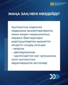 Заң Қылмыстық кодекске медицина қызметкерлерінің, сондай-ақ жедел медициналық жәрдем бригадаларының жүргізушілерінің қызметтік міндеттерін атқару кезінде олардың өміріне, денсаулығына және қауіпсіздігіне қол сұғушылық үшін қылмыстық жауаптылықты белгілейтін жаңа бапты енгізуді көздейді.