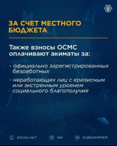 - осуществлять взносы в Фонд медицинского страхования за экономически неактивное население для получения гражданами медицинской помощи предоставляемой в рамках ОСМС. Казахстане численность экономически неактивного населения составляет около 10 млн. человек. Это дети, пожилые лица, многодетные матери, беременные женщины, неработающие инвалиды и т.д.
