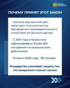 Ранее Глава государства поручил Правительству разработать изменения в законодательство, направленные на ужесточение наказания за нападения на медицинских работников с применением физической силы и проявлением жестокости.