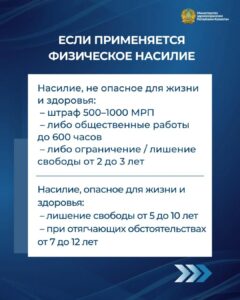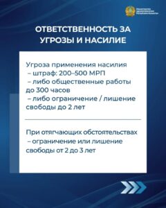 • за угрозу применения насилия, предусматривается наказание в виде штрафа от 200 до 500 месячных расчётных показателей (МРП), либо исправительных работ в том же размере, либо общественных работ до 300 часов, либо ограничения или лишения свободы сроком до 2 лет;